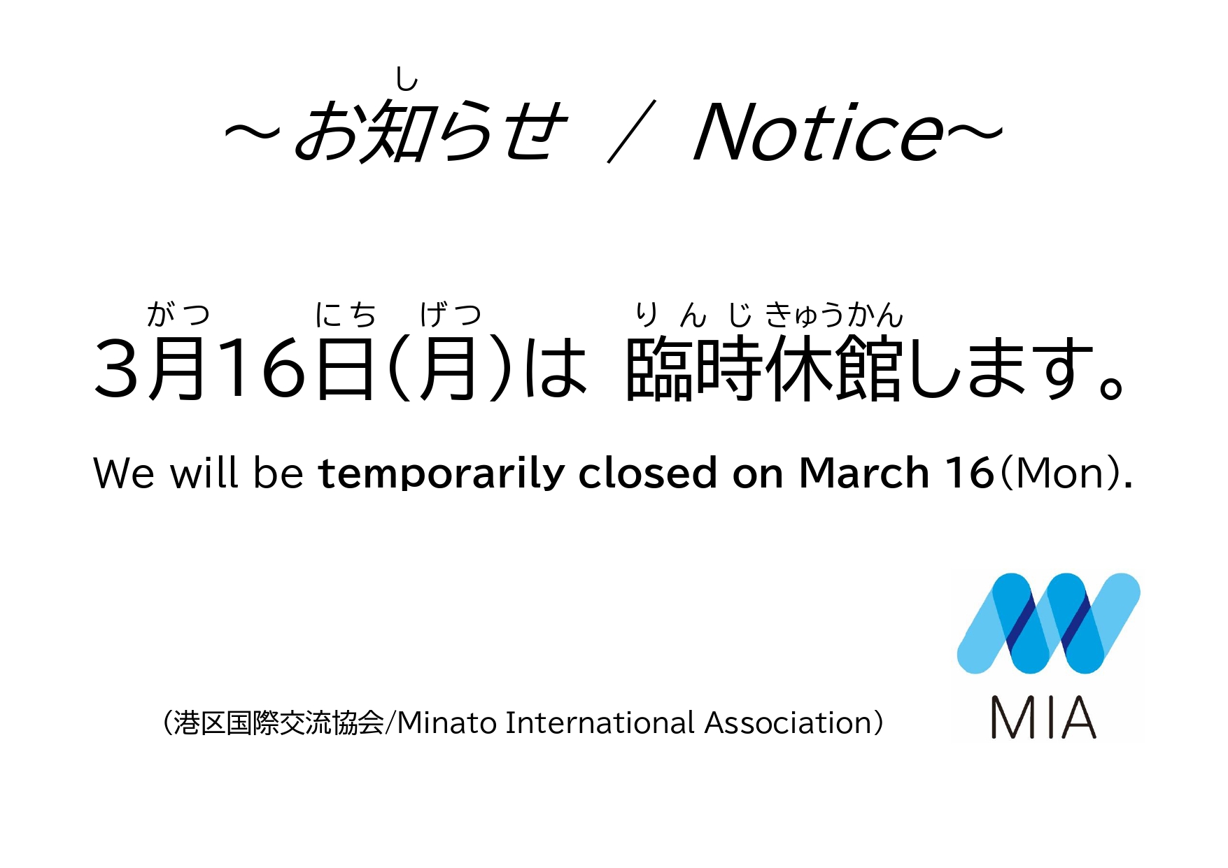 設備点検のため、3月16日(月)は国際交流スペース(港区国際交流協会)を臨時休館いたします。ご不便ををおかけしますが、なにとぞご了承ください。
