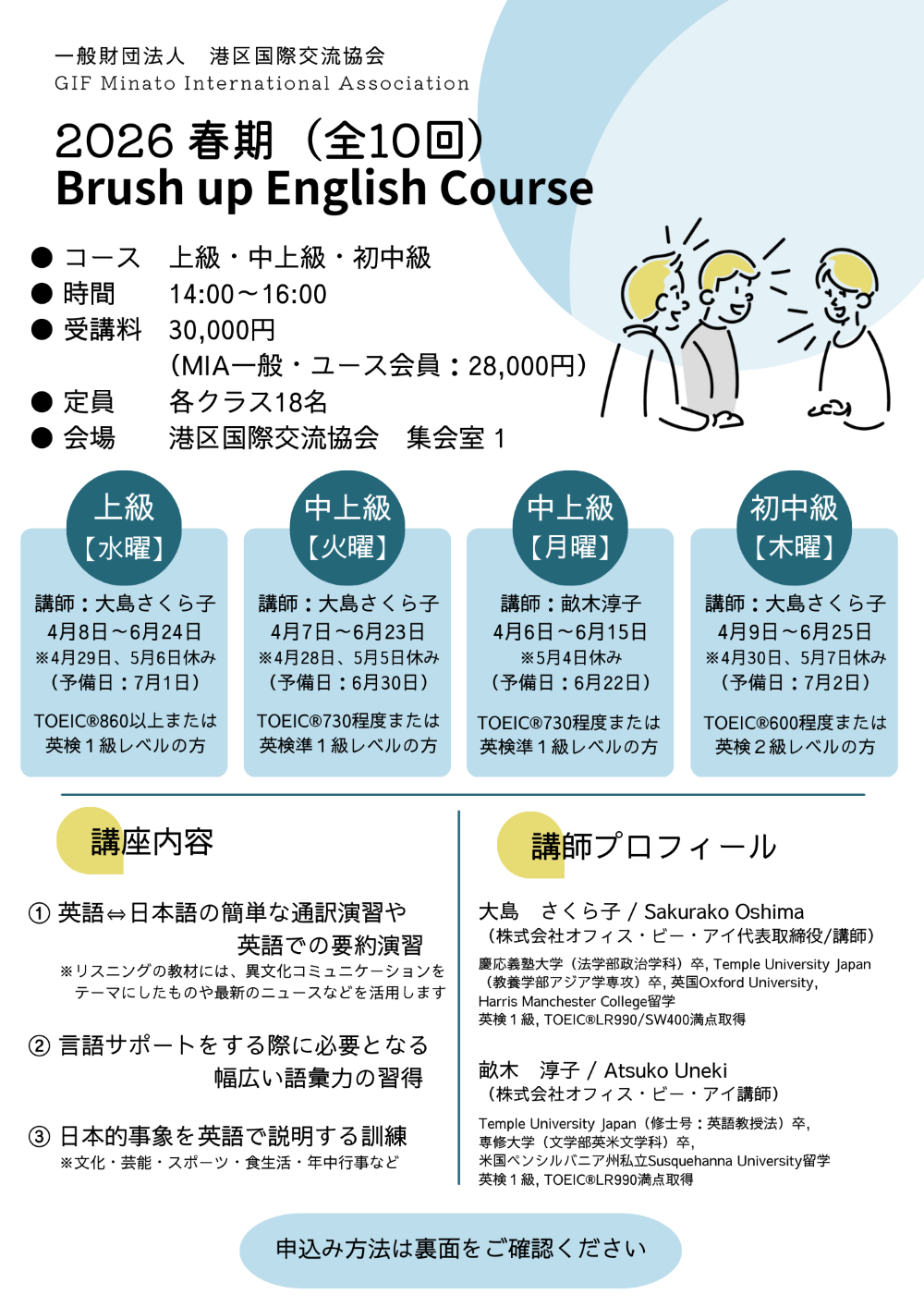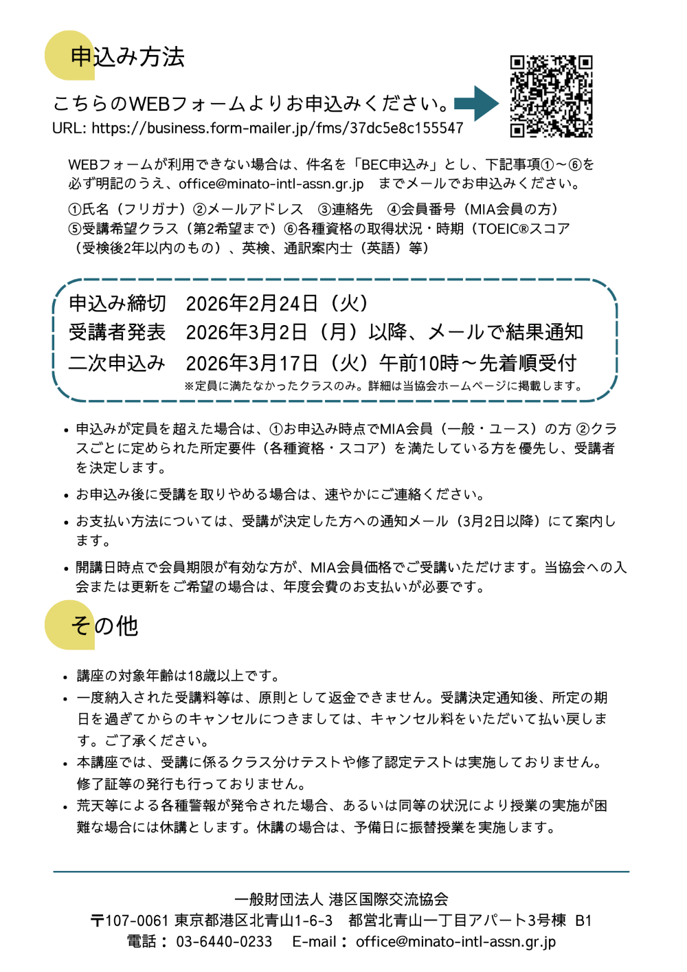 WEBフォームが利用できない場合は、件名を「BEC申込み」とし、下記事項①~⑥を必ず明記のうえ、office@minato-intl-assn.gr.jp までメールでお申込みください。