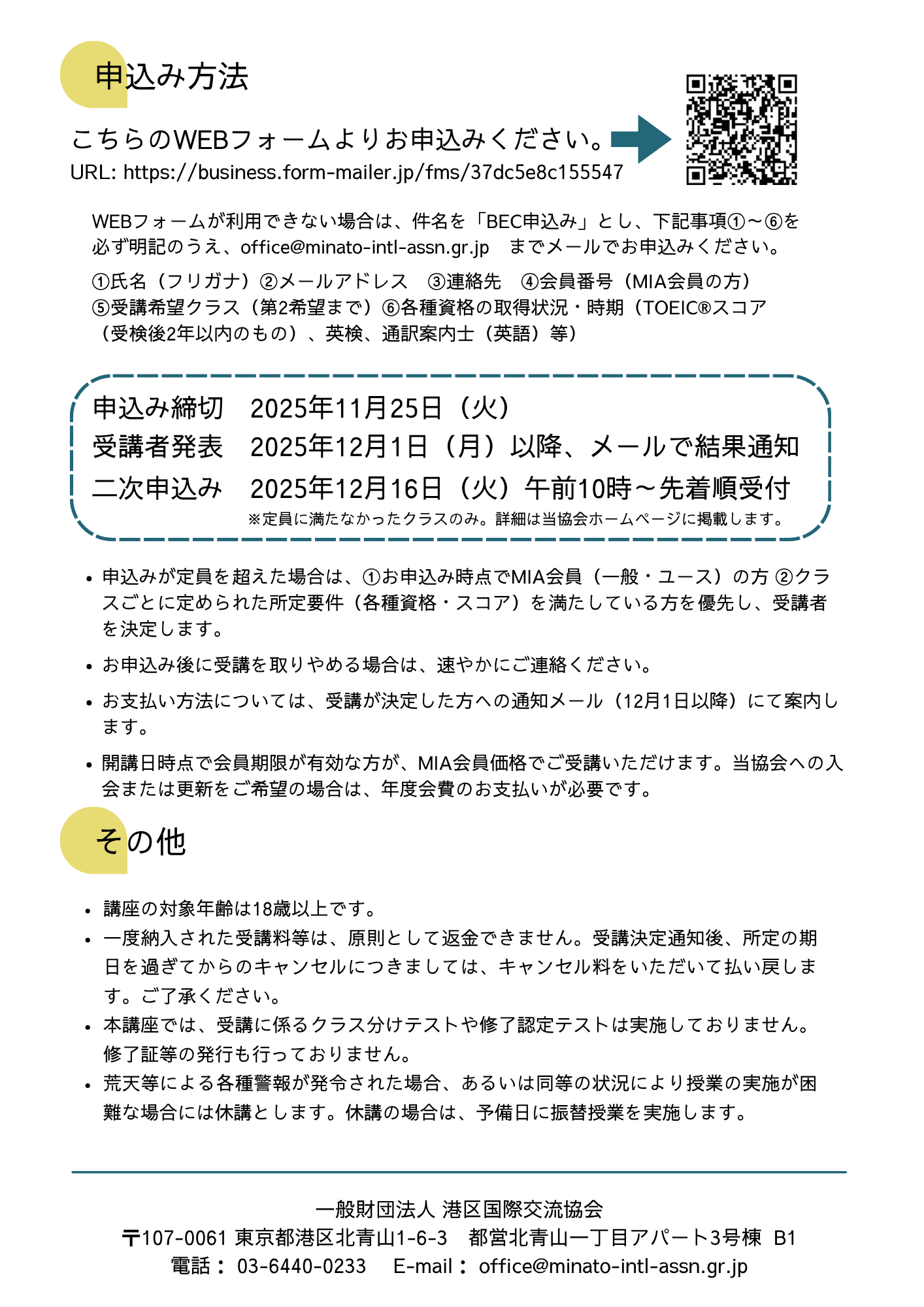 | 申し込み方法 | こちらのWEBフォームよりお申込みください。 *申込み締切* ●受講者発表 —– WEBフォームが利用できない場合は、件名を「BEC申込み」とし、下記事項①~⑥を必ず明記のうえ、office@minato-intl-assn.gr.jp までメールでお申込みください。 —– |